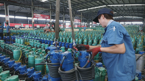 經(jīng)過工人們1個(gè)多小時(shí)的精心調(diào)試, 80臺(tái)小型潛水泵被迅速裝上車。